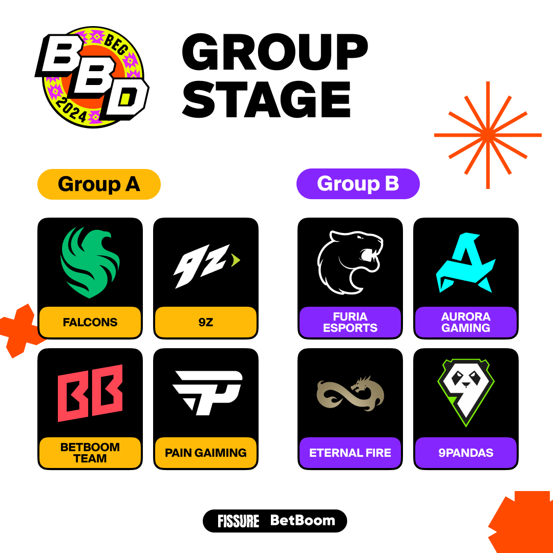 Con esto los equipos que están en la fase de grupos son 9z Team, Furia Esports, paiN Gaming, Aurora Gaming, Eternal Fire, BetBoom Team, 9Pandas, y Team Falcons. Ellos ya han sido ubicados en dos brackets de doble eliminación donde se juegan series al mejor de tres mapas (Bo3), y pasan los dos mejores de cada bracket.