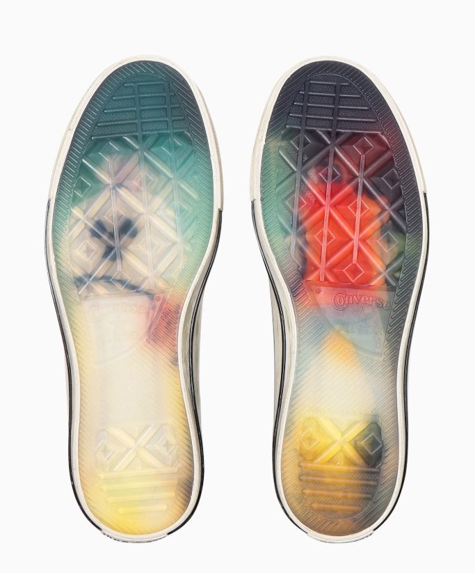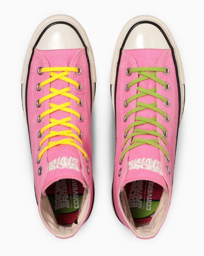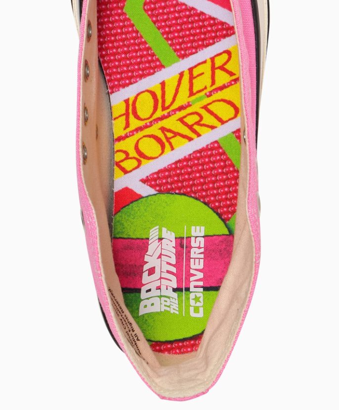 De ahí tenemos unas Chuck rosadas, que están inspiradas en la mítica Hoverboard (Skate Volador) que Marty usa en el futuro. Este par traer pasadores en colores amarillos, y verdes. Y plantillas personalizadas.