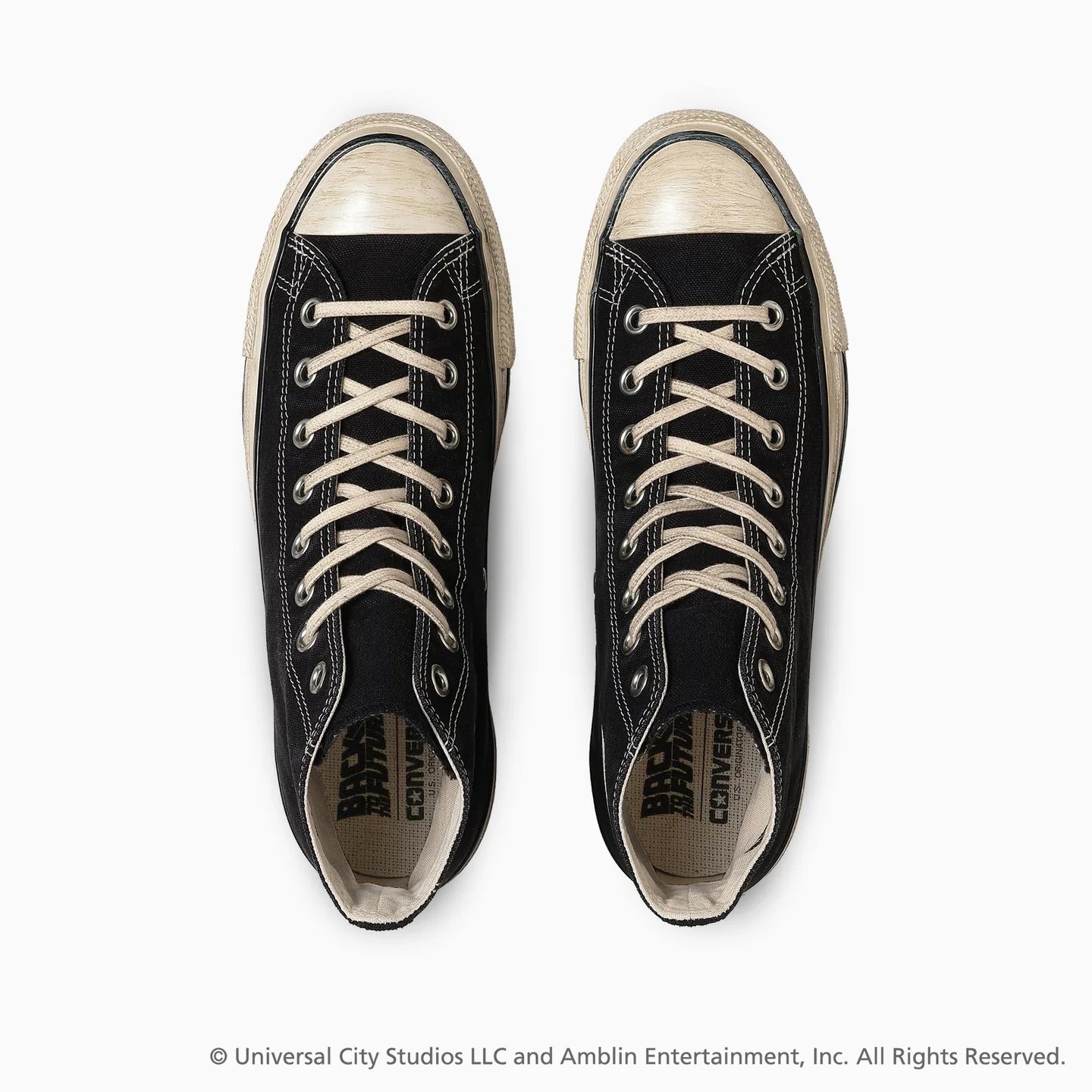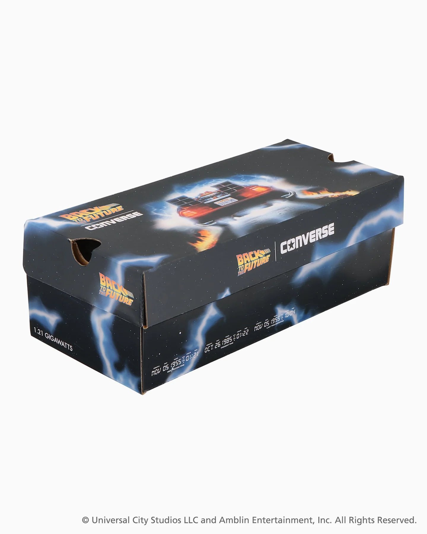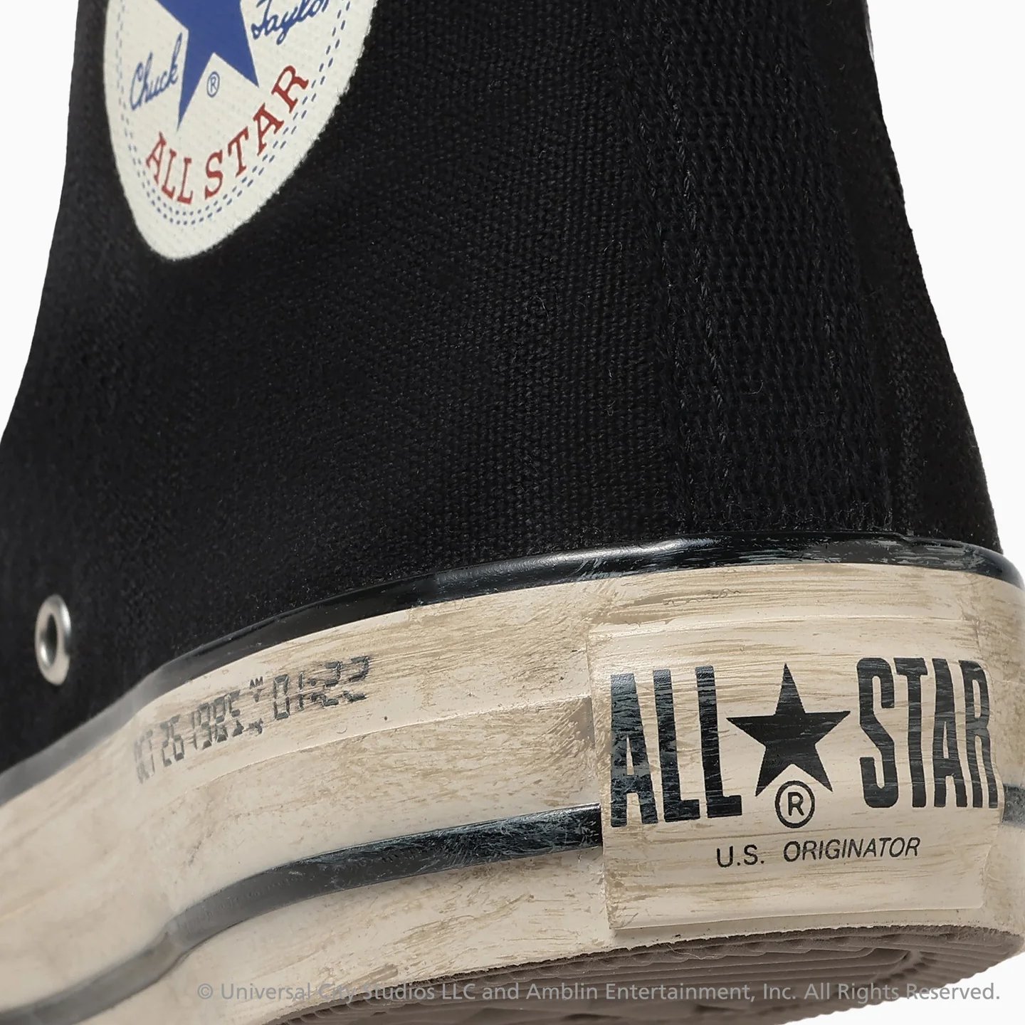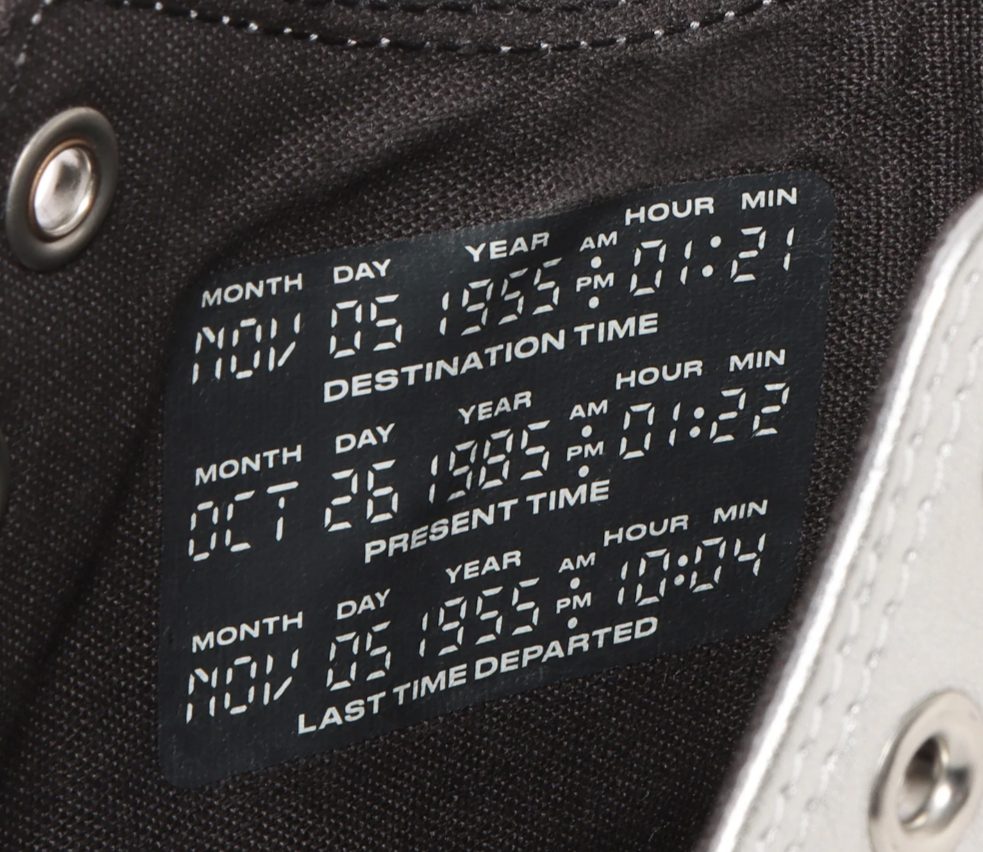 Tenemos las clásicas Chuck en color negreo que vienen inspiradas en los datos del tablero del DeLoream, y claro también ese aspecto de usas que converse viene dándole a algunos de sus modelos. Tanto dentro de la zapatilla como a un lado, tenemos las fechas del viaje en el tiempo que es la siguiente