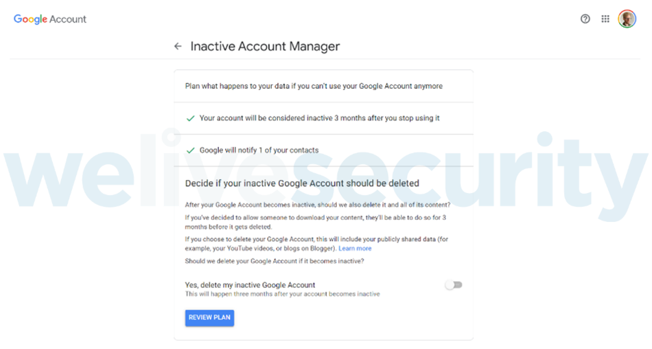 3. Google: Lo más probable es que se utilicen muchos servicios de Google, incluidos Gmail, YouTube o incluso Google Drive. Para evitar que la información importante se vuelva inaccesible, se puede habilitar el Administrador de cuentas inactivas de Google. Entonces Google podrá detectar la inactividad de la cuenta y emitir un enlace descargable a un contacto que se haya elegido previamente. El período de tiempo que determina la inactividad lo decide el usuario, al igual que qué datos se pueden descargar. También se puede decidir si una cuenta debe eliminarse tres meses después de que se haya compartido con el contacto heredado. Sin embargo, esto implica que se eliminará todo el contenido, incluidos los videos de YouTube o las publicaciones de blog, una razón por la que no todos podrían querer habilitar esta opción.