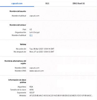 Al analizar el sitio falso, ESET identificó que el certificado utilizado por los cibercriminales para el protocolo HTTPS es válido desde el 08-04-2025 hasta el 07-07-2025. Esta información da una idea de la posible duración de la campaña maliciosa y representa, además, otro indicio para cuestionar la legitimidad del sitio.