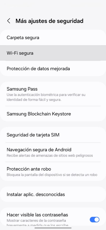 Configuración > Seguridad y Privacidad > Más Configuraciones de Seguridad > Wi-Fi segura