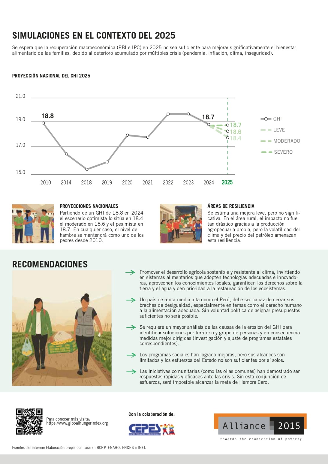 En este contexto, la red Alliance2015 ha proyectado tres escenarios de impacto (leve, moderado y severo) de la coyuntura económica sobre el GHI a nivel nacional y subnacional. En caso se mantenga estable la economía, no será suficiente para revertir la crisis alimentaria que enfrenta el país. En un escenario pesimista (impacto severo), el GHI pasaría de 18.8 (2024) a 18.7 puntos, en un escenario moderado a 18.6 y optimista a 18.4. En todos los casos, el nivel de hambre en 2025 se mantendría entre los más altos desde 2010 (18.8).