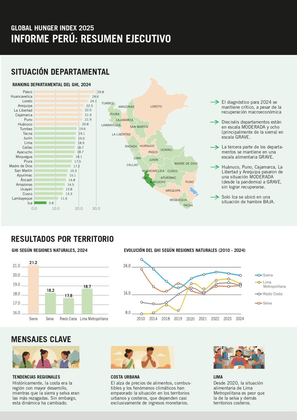 Al cierre de 2024, ocho departamentos —principalmente de la sierra— se encuentran en situación grave de hambre: Pasco, Huancavelica, Loreto, Arequipa, La Libertad, Cajamarca, Puno y Huánuco. Asimismo, 16 departamentos presentan niveles moderados, mientras que solo Ica registra un nivel bajo de hambre.