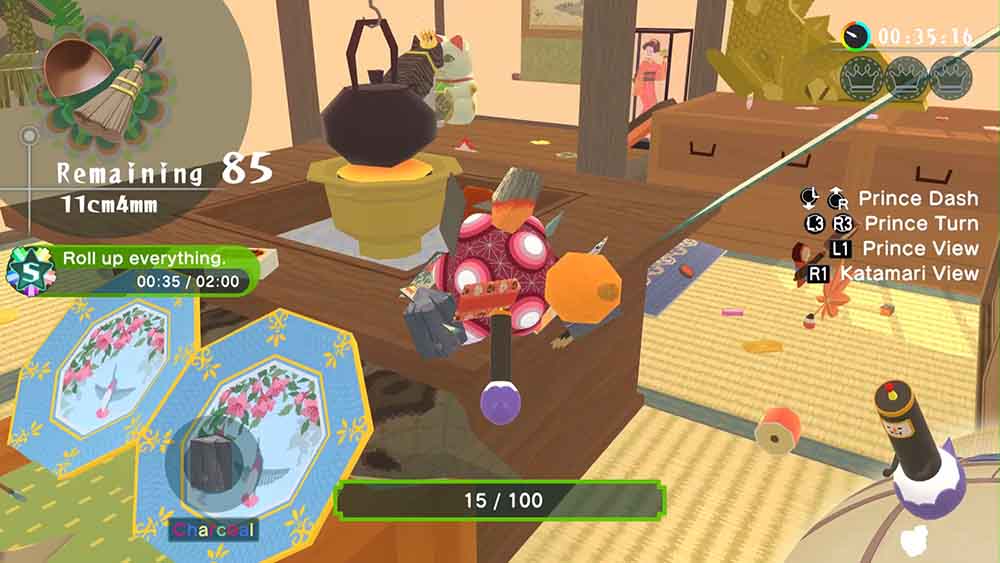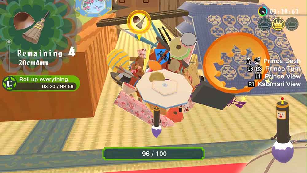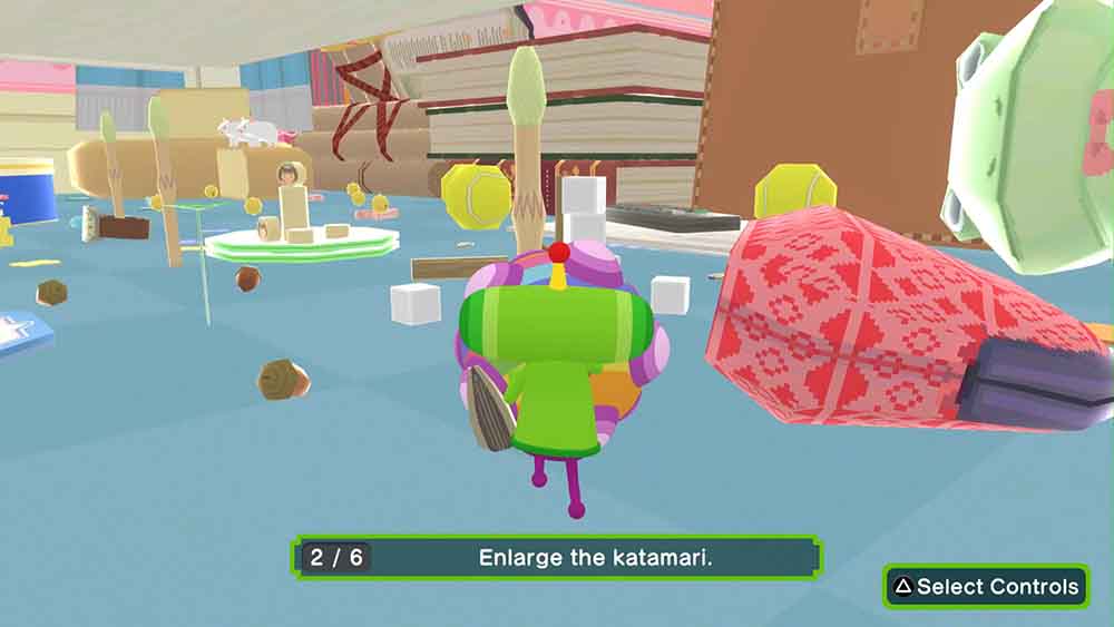 La jugabilidad consiste en controlar la bola katamari con dos joysticks analógicos, moviéndolos hacia adelante y/o hacia atrás simultáneamente. Se puede girar el katamari empujando solo un joystick en la dirección deseada o empujándolos en direcciones opuestas para hacerlo más rápido —algo parecido a los controles de un tanque. Los jugadores también pueden hacer un giro de 180 grados haciendo que El Príncipe salte al otro lado del katamari, generalmente presionando ambos joysticks hacia abajo en el control.