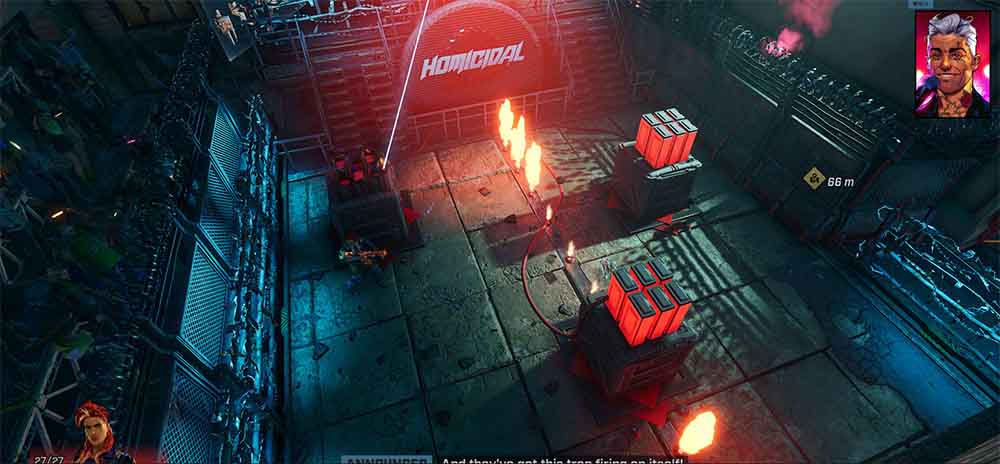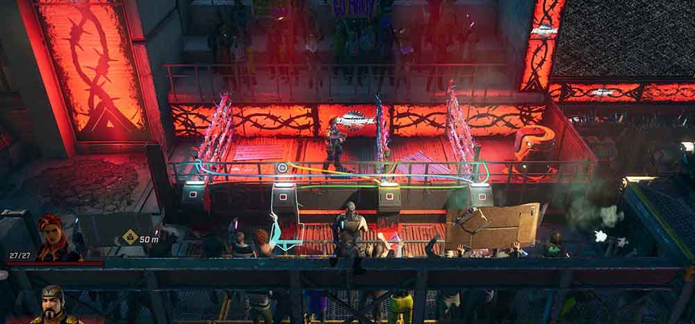 Con este preámbulo recibimos Showgunners, un título desarrollado por el estudio polaco Artificer y distribuido por el publisher neerlandés Good Shepherd. La trama retoma esta premisa tipo Thunderdome (“¡Dos hombres entran, solo uno sale!”) en un futuro distópico, donde la corporación Omega transmite el programa Homicidal All-Stars. La protagonista de “esta temporada” es la misteriosa cazarrecompensas Scarlett Martillo, cuya historia se entrelaza con una subtrama de venganza. Otro personaje destacado es Marty, un veterano jugador que busca su segundo título. El objetivo consiste en avanzar por escenarios enfrentando enemigos que aumentan en dificultad conforme progresa el juego.