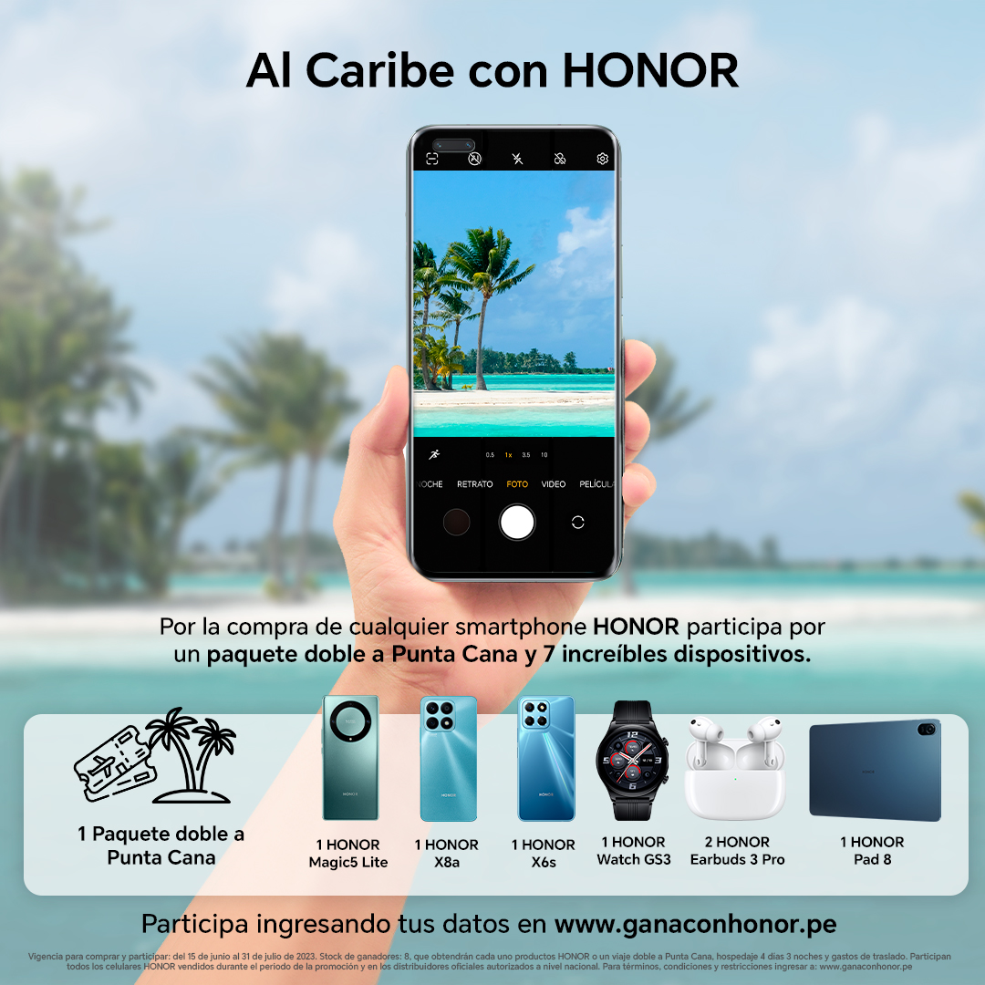 ¿Cuántas veces tenemos la oportunidad de ganar un paquete doble todo pagado a Punta Cana? A través de la campaña “Al Caribe con HONOR”, todos los usuarios que compren un smartphone HONOR podrán registrarse y participar, hasta comprando equipos de gama de entrada de menos de 700 soles como los miembros de la HONOR X Series como HONOR X6s u HONOR X7a, o hasta gama media como el HONOR X8a de menos de 1000 soles.